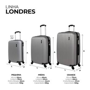 As malas de Viagem Londres possuem 4 rodas que giram 360 graus, carrinho embutido regulável, alça superior, e alça lateral nos tamanhos M e G, e fechadura com segredo. Além disso, a parte interna das malas é totalmente forrada em poliéster, tem cinta elástica cruzada com trava e bolso interno.