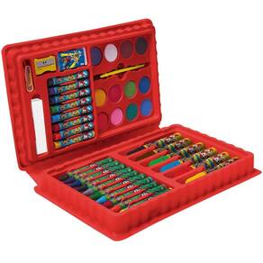 12 cores de aquarela 10 giz de cera 08 pasteis oleosos 06 hidrocores ponta grossa 02 clipes de papel 01 pincel 01 apontador 01 borracha 01 esponja
