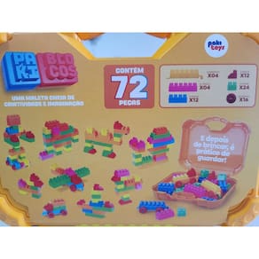 Kit Maleta Blocos de Montar Criar Divertire Inventar e desmontar 72 Pakitoys peças Com a Maleta Infantil Blocos De Montar 72 Peças Paki Toys a brincadeira nunca acaba. Isso porque, este brinquedo é lúdico e possibilita que as crianças usem toda a imaginação para criar.Os blocos de montar estimulam o desenvolvimento e a imaginação dos seus filhos, além de contribuir para a percepção de cores e desenvolver a coordenação motora.Recomendado para crianças a partir de 3 anos de idade, os blocos de montar possuem 72 peças e acompanham uma embalagem prática que permite que os blocos sejam guardados na própria embalagem. Dimensões aproximada da embalagem: 22cm de altura x 8cm de largura x 26 comprimento Marca: Pakitoys CONTÉM: 1 maleta Homologação Inmetro: CE-BRI/ICEPEX-N 01396-65-1