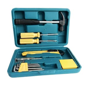 Kit ferramenta 11 peças em maleta plástico. Estojo com detalhes retangulares frente e verso liso, possui texturização na mala e uma trava superior design rústico e simples. Versátil para pequenos reparos que possam ocorrer no dia dia. Perfeito para ter em casa, super compacto. Possui uma maleta de plastico de alta qualidade, garantindo a resistência contra quedas além de manter as ferramentas organizadas, acompanha: Martelo, Jogo Chave Allen 5pçs , Chave Philips, Chave de Fenda, Chave Teste, Trena 1 metro e Estilete.