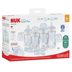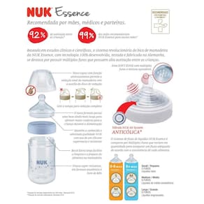 A mamadeira Nuk Essence Smart Flow possui o sistema de válvula nuk Air System anti cólica. Este sistema é um sistema de ventilação que reduz a formação e ingestão de bolhas de ar durante a alimentação. O sistema de fluxo de líquidos nuk Essence é composto por múltiplos furos que variam em quantidade para assegurar um fluxo adequado de acordo com a consistência de cada alimento, para a criança se alimentar da forma correta.