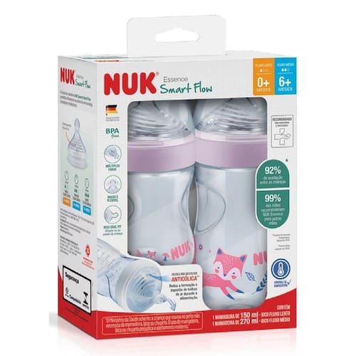 A saúde do bebe é diretamente relacionada a alimentação dele. Muitas vezes, o bebê precisa do auxilio de mamadeiras para poder ficar mais gordinho e fortinho As mamadeiras Nuk Essence Smart Flow são livres de BPA (BPA Free) e tem 02 mamadeiras que permitem ser usadas em momentos diferentes da vida do bebe. A mamadeira de 150mL é recomendada para os recém nascidos (0+ meses), e a mamadeira de 270mL para bebês de 6+ meses. A mamadeira Nuk Essence Smart Flow possui o sistema de válvula NUK Air System ANTI CÓLICA. Este sistema é um sistema de ventilação que reduz a formação e ingestão de bolhas de ar durante a alimentação. O sistema de fluxo de líquidos NUK Essence é composto por múltiplos furos que variam em quantidade para assegurar um fluxo adequado de acordo com a consistência de cada alimento, para a criança se alimentar da forma correta. As mamadeiras da NUK possuem controle de temperatura, se o conteúdo do frasco estiver muito quente, o indicador de temperatura ficará branco, sendo necessário aguardar o indicador a voltar a cor azul para oferecer o copo a criança. As mamadeiras também são testadas clinicamente e, devido à similaridade dos padrões de sucção, permite uma alimentação mista, com a combinação da amamentação e alimentação por mamadeiras. Os bicos em silicone extra macio e resistentes da linha Essence possuem o topo curvado que se adapta-se ao palato da criança. Ele também é Ortodôntico e possui todos os requisitos para uma boa alimentação do seu bebê. O Sistema de ventilação permite que o bico, ao ser pressionado, libere o ar evitando o colabamento (entupimento) do bico. Principais Características: -controle de temperatura -bico com múltiplos furos -nova tampa antivazamento -novo formato do bico com base ainda mais larga -frasco super-resistente em formato anatômico (ergonômico) e livre de bpa -anticólica Conteúdo da embalagem: -mamadeira 150ml. Indicado para bebês de +0 mês, com bico de fluxo lento tamanho 1. -mamadeira 270ml. Indicado para bebês de 6+ meses, com bixo de fluxo médio tamanho 2. Este produto é certificado pelo INMETRO: CE-PUR/IQB-000611 - NBR 13793 - OCP 0006 O Ministério da Saúde adverte: A criança que mama no peito não necessita de mamadeira, bico ou chupeta. O uso de mamadeira, bico ou chupeta prejudica o aleitamento materno.