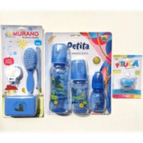 Tudo que seu bebê precisa para o nascimento, um kit com 3 mamadeiras para diversas ocasiões, com uma chupeta pequena para recém nascidos e por ultimo um kit super prático com pente, saboneteira e prendedor de chupeta