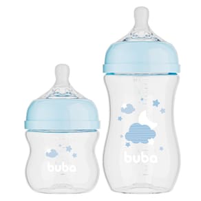 O kit inclui 2 mamadeiras com capacidade de 120ml e 270ml e bicos fluxo tamanhos 1 e 2.