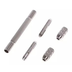 O mandril é feito de cobre e liga de alumínio, com tratamento de superfície cromado, o que garante durabilidade e resistência. Possui um comprimento de 105 mm e uma faixa de fixação que varia de 0,3 mm a 3,2 mm. Sua cor prateada confere um aspecto profissional e elegante.