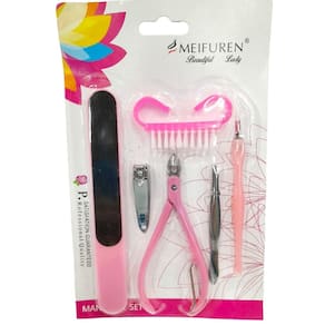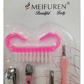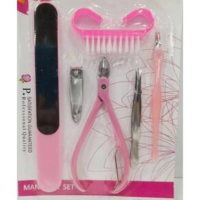 01 lixa, escova, 01 cortador de unha, 01 alicate de cutícula, 01 pinça e 01 aparador de cutícula.