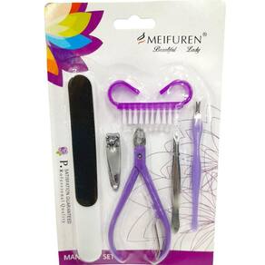 01 lixa, escova, 01 cortador de unha, 01 alicate de cutícula, 01 pinça e 01 aparador de cutícula.