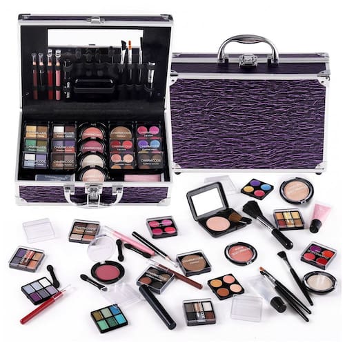 Kit maquiagem completo CHARMCODE com estojo de alumínio reutilizável, contendo 2 lápis para olhos, 2 lápis para lábios, 1 máscara, 1 pó facial compacto, 4 aplicadores puff, 4 pincéis, 6 paletas compactas de sombras, 2 blushes, 2 iluminadores, 1 contorno, 2 paletas compactas de cores labiais, 1 pó para sobrancelhas compacto, 1 sombra cremosa compacta, 1 corretivo cremoso compacto, 2 tubos de gel cremoso labial e espelho acoplado.