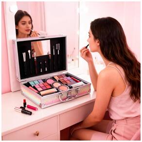 Kit maquiagem completo tudo em um Mileonaim para aplicação de looks variados, incluindo paleta de sombras com 24 cores, gloss labial, blush, iluminador e ferramentas essenciais como pincéis. Projetado para portabilidade com estojo rígido multifuncional para armazenamento e transporte de cosméticos.