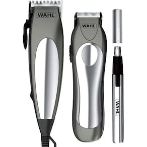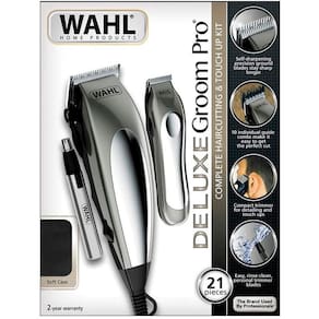 O Deluxe Groom Pro é um kit completo que inclui uma máquina de corte, um aparador de pelos gerais à pilha e um aparador de nariz e orelha à pilha. É como ter uma barbearia em casa, o kit é muito prático e fácil de usar. Com ele, você tem autonomia para cortar cabelo e aparar todos os pelos da face, como costeletas, cavanhaque, bigode, barba, nariz e orelhas, sem sair do seu banheiro.
