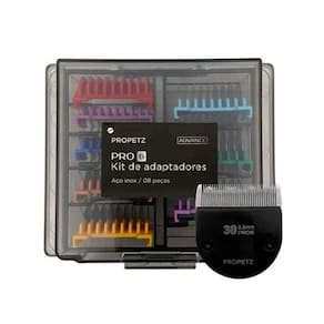 O Combo Máquina de Tosa Propetz PRO6, Kit de Adaptadores Pet de Aço Inox 8 Peças e Lâmina de Tosa n 30 foi desenvolvido para auxiliar as tosas em cães e gatos, pois com esse combo é possível obter uma grande variedade de cortes e alturas, muito superiores às lâminas de tosa convencionais.Máquina de Tosa Propetz PRO6 Bivolt, pode ser utilizada com ou sem fio, é potente, leve e silenciosa. Desenvolvida especialmente para o groomer que busca um equipamento de qualidade.O Kit de Adaptadores Pet de Aço Inox para Máquina de Tosa Propetz PRO6 acompanha a lâmina de tosa n 30 e uma caixa de armazenamento. A lâmina de tosa n30 tem base em plástico e lâmina em aço inox com cortante de cerâmica. A caixa de armazenamento é perfeita para proteger e organizar seus equipamentos, sendo cada compartimento é individual para cada peça. A caixa é fabricada em plástico altamente resistente, facilitando o transporte e também a sua limpeza.Os adaptadores são excelentes para reduzir o tempo na tosa. Uma tosa com finalização na tesoura que levaria em torno de 01h30min. Em um cão de grande porte. Usando a Máquina de Tosa PRO6 com o Kit de Adaptadores para Máquina de Tosa Propetz PRO6 levaria 30 min. Para tosar a o mesmo cachorro. O encaixe se dá APENAS na lâmina de tosa exclusiva para a Máquina de Tosa PRO6 n30.Características da Máquina de Tosa Propetz PRO6 Bivolt: Indicada para realizar a finalização de tosa em cães e gatos; Possui 5 velocidades; Trabalha com ou sem fio; Possui Painel Digital em LCD; Peso: 225g; Motor silencioso; Carga completa em menos de 3 horas e duração de até 5 horas em uso contínuo; Bivolt (100-240V 50/60Hz); Velocidade da máquina: 5000 a 7000 RPM.COR: PRETACaracterísticas do Kit de Adaptadores Pet de Aço Inox 8 Peças para Máquina de Tosa PRO6 PropetzCompatível APENAS com a Máquina de Tosa Pro6 Propetz;Utilização apenas com a lâmina de tosa PRO6 n 30 de plástico não afiável;Alturas: 3mm, 6mm, 10mm, 13mm, 16mm, 19mm. 22mm e 25mm;Características do Lâmina de Tosa - Propetz: Compatível APENAS com a Máquina de Tosa Pro6 Propetz; Base em plástico e lâminas em aço inox com cortante de cerâmica; Tamanho Lâmina: n30 ou 0,5mm; Cortante de cerâmica.