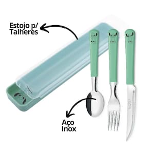 -Talheres personalizados: Feitos em aço inox com cabos decorados, acompanhados de um estojo prático para transporte.