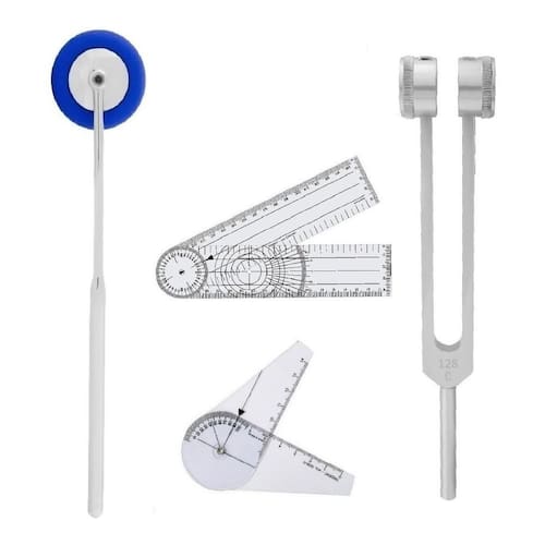 INCLUSO NO KIT 1- Martelo ( Modelo a ser Escolhido ) 1- Diapasão 128 HZ 1- Goniometro 35cm em PVC 1- Goniometro De Dedo O Martelo BUCK, TAYLOR Ou BAMBINSK para reflexos neurológico é indicado para uso em procedimentos ambulatoriais como também, para aferir sensibilidade e reflexos neurológicos. Os martelos de percussão neural são indicado para induzir a resposta miotática, plantar e cutânea, nos exames de rotina para avaliação dos reflexos do paciente. Martelo para Reflexos Neurológicos BIC; Cabeça com pontas de PVC ; Examinador de reflexo; Confeccionado em metal; Não Estéril e Reutilizável; Qualidade e confiança BIC. Material do Cabo: Metal cromado Material Cabeça: PVC Sintético Instruções de Uso: Deve ser utilizado de acordo com a técnica adotada pelo profissional de saúde. Advertências e Precauções: Não deixar o martelo em superfície molhada ou excesso de calor / Deve ser utilizado por profissional habilitado / Manter o instrumento longe do alcance de crianças. Garantia: 1 ano garantia contra defeito de fabricação Marca: BIC Bem Estar Cadastro na ANVISA: 81535970006 O Diapasão médico STARK BIC 128 CPS com fixador é um instrumento utilizado por profissionais da saúde na avaliação e testes audiológicos na verificação de perda auditiva. O diapasão serve como fonte condutora para a transmissão dos sons por via aérea e via óssea e pode ajudar a direcionar o diagnostico nos casos de lesão do sistema auditivo, tanto relativo ao local quanto à causa da lesão. DIAPASÃO 128 HZ Modelo: 128HZ Material: Alumínio Comprimento Total: 216mm Largura Total: 41mm Garantia: 1 ano contra defeito de fabricação Marca: BIC Cadastro na ANVISA: 81535970007 GONIOMETRO GRANDE Goniômetro Universal em plástico transparente com 2 réguas para mensuração de amplitude articular. Sistema de transferidor de 0º a 360º . Medidas aproximadas 21,5 x 5cm (CxL). Largura: 5 cm Profundidade: 0,75 mm Peso: 0.01Kg Comprimento: 21,5cm GONIOMETRO PEQUENO DE DEDO GONIÔMETRO PEQUENO - DEDO Modelo tradicional pequeno, de dedo, muito resistente ao uso continuo. fornecido em PVC vulcanizado de 0,75 mm de espessura. Composto por duas réguas, gravadas fotoquimicamente e unidas por um forte rebite que permite um giro de até 360° das réguas. Com espaçador plástico para previnir o desgaste das escalas por atrito. Escalas com divisão em mm nas laterais e transferidor de 90° com divisão de grau em grau. Largura: 6cm Profundidade: 0,75 mm Peso: 0.01Kg Altura: 16cm
