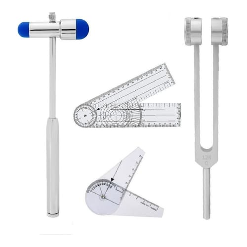 INCLUSO NO KIT 1- Martelo ( Modelo a ser Escolhido ) 1- Diapasão 128 HZ 1- Goniometro 35cm em PVC 1- Goniometro De Dedo O Martelo BUCK, TAYLOR Ou BAMBINSK para reflexos neurológico é indicado para uso em procedimentos ambulatoriais como também, para aferir sensibilidade e reflexos neurológicos. Os martelos de percussão neural são indicado para induzir a resposta miotática, plantar e cutânea, nos exames de rotina para avaliação dos reflexos do paciente. Martelo para Reflexos Neurológicos BIC; Cabeça com pontas de PVC ; Examinador de reflexo; Confeccionado em metal; Não Estéril e Reutilizável; Qualidade e confiança BIC. Material do Cabo: Metal cromado Material Cabeça: PVC Sintético Instruções de Uso: Deve ser utilizado de acordo com a técnica adotada pelo profissional de saúde. Advertências e Precauções: Não deixar o martelo em superfície molhada ou excesso de calor / Deve ser utilizado por profissional habilitado / Manter o instrumento longe do alcance de crianças. Garantia: 1 ano garantia contra defeito de fabricação Marca: BIC Bem Estar Cadastro na ANVISA: 81535970006 O Diapasão médico STARK BIC 128 CPS com fixador é um instrumento utilizado por profissionais da saúde na avaliação e testes audiológicos na verificação de perda auditiva. O diapasão serve como fonte condutora para a transmissão dos sons por via aérea e via óssea e pode ajudar a direcionar o diagnostico nos casos de lesão do sistema auditivo, tanto relativo ao local quanto à causa da lesão. DIAPASÃO 128 HZ Modelo: 128HZ Material: Alumínio Comprimento Total: 216mm Largura Total: 41mm Garantia: 1 ano contra defeito de fabricação Marca: BIC Cadastro na ANVISA: 81535970007 GONIOMETRO GRANDE Goniômetro Universal em plástico transparente com 2 réguas para mensuração de amplitude articular. Sistema de transferidor de 0º a 360º . Medidas aproximadas 21,5 x 5cm (CxL). Largura: 5 cm Profundidade: 0,75 mm Peso: 0.01Kg Comprimento: 21,5cm GONIOMETRO PEQUENO DE DEDO GONIÔMETRO PEQUENO - DEDO Modelo tradicional pequeno, de dedo, muito resistente ao uso continuo. fornecido em PVC vulcanizado de 0,75 mm de espessura. Composto por duas réguas, gravadas fotoquimicamente e unidas por um forte rebite que permite um giro de até 360° das réguas. Com espaçador plástico para previnir o desgaste das escalas por atrito. Escalas com divisão em mm nas laterais e transferidor de 90° com divisão de grau em grau. Largura: 6cm Profundidade: 0,75 mm Peso: 0.01Kg Altura: 16cm