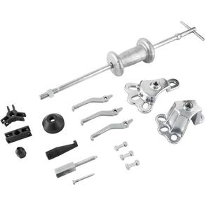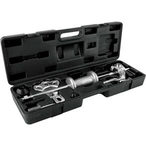 1 Martelo para extração de cubos de rodas. Acompanha: 1 bloco transversal 2 vias, 1 batente limitador, 2 extratores para cubos de roda, 1 extrator interno / externo de 3 garras, 1 extrator interno / externo de 2 garras, 1 parafuso de repuxo, 1 gancho extrator, 1 adaptador para alicate de pressão, 1 jogo de 3 garras e 1 maleta.