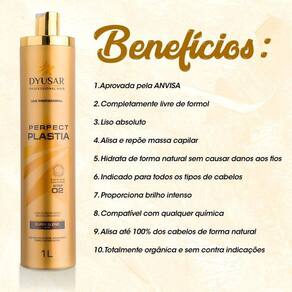 A escova Progressiva Dyusar Perfect Plastia é um realinhamento capilar sem formol que alisa 100% todos os tipos de cabelos ao mesmo tempo em que trata e hidrata, protegendo os fios e repondo a massa capilar para maciez, brilho e efeito liso duradouro.