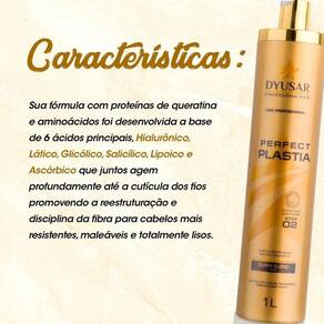 A escova Progressiva Dyusar Perfect Plastia é um realinhamento capilar sem formol que alisa 100% todos os tipos de cabelos ao mesmo tempo em que trata e hidrata, protegendo os fios e repondo a massa capilar para maciez, brilho e efeito liso duradouro. Sua fórmula com proteínas de queratina e aminoácidos foi desenvolvida a base de 6 ácidos principais, Hialurônico, Lático, Glicólico, Salicílico, Lipoico e Ascórbico que juntos agem profundamente até a cutícula dos fios promovendo a reestruturação e disciplina da fibra para cabelos mais resistentes, maleáveis e totalmente lisos.