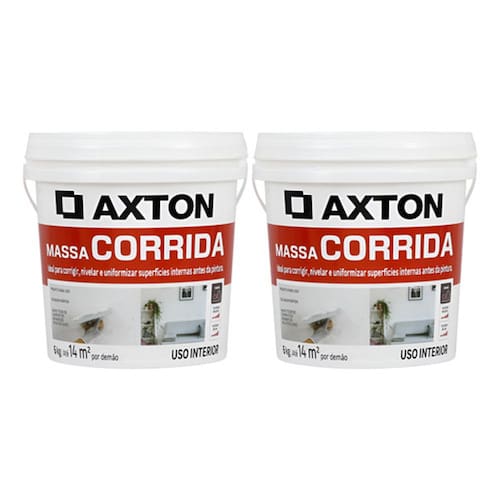 "O Kit Massa Corrida Interna 6 kg Axton - 2 Unidades e o produto ideal para quem busca qualidade e eficiencia em suas obras e reformas. Com um rendimento de ate 14 m2, essa massa corrida da linha Complemento e a escolha certa para quem deseja um acabamento perfeito em paredes internas de alvenaria. Sua cor branca permite que voce tenha liberdade para pintar da cor que desejar apos a aplicacao.