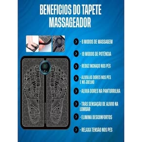 kit contém:01 massageador cervical de pulso elétrico01 tapete massageador de pulso elétricodescrição do massageador cervical:este é um massageador portátil com ajuste de 10 velocidades, pode efetivamente aliviar as dores em diferentes lugares como pescoço, costas, cintura, nádegas, pernas, e entre outros. Fácil de usar e transportar. Como usar:- instale o host no patch. Note que o filme transparente no adesivo deve ser removido antes que ele possa funcionar normalmente- fixe o instrumento na peça que precisa sermassageada- pressione o botão + para ligar a máquina, a luz está sempre acesa- observe que você precisa pressionar a tecla + novamente para ligar a máquina- depois que a luz piscar, você pode selecionar o modo de massagem- pressione o botão m para selecionar o modo desejado- ajuste a intensidade da massagem para se adequar a você. Segure + para aumentar a intensidade e - para diminuir a intensidadeinformações técnicas:- frequência: 1-100 hz- trabalhando: 160 minutoscuidados a serem tomados:- não mantenha em altas ou baixas temperaturas ou umidade ao armazenar a unidade- a sujeira no pack atrapalha o efeito do usomodo de limpeza:- limpe o ponto sujo do massageador com pano úmido com material neutro- limpe novamente com pano secoinformações adicionais:- pode ser transportado a qualquer momento, pode ser colocado na bolsa, viagem, escritório, etc. Você também pode relaxar- alivia a fadiga e pode ser utilizado no pescoço, ombros e costas- 19 níveis ajustáveis, escolha uma intensidade de massagem confortável- técnica de massagem: shiatsu, amassamento, batidas e etc. - um bom presente para sua família, amigos, pais, esposa, marido entre outros- parte da massagem: corpo todo. Material:- plástico absitens inclusos:- 1 massageador portátil- 1 cabo de carregamento- 1 manual de instruçõesdescrição do tapete massageador:se você também sente dores nos pés, você faz parte de 36% da população de todo o mundo que também sentem o mesmo problema, mais não se preocupe, trouxemos para você o mais inovador e tecnológico massageador de pés do mundo. Ele age nas dores por eletroestimulação, ondas magnéticas de baixa e media intensidade, que em poucos minutos de uso já trazem um relaxamento nos músculos dos pés, deixando muito conforto e satisfação após o uso. Depois de um dia estressante de trabalho , nada melhor que uma massagem relaxante nós pés. Segundos estudos recentes, massagens nos pés aumentam consideravelmente o nível de serotonina, hormônio responsável pelo humor e bem-estar. Trazendo assim muito conforto e qualidade de vida para os usuários do produto. O que é a tecnologia emsestimulação elétrica do músculo ems , igualmente como a eletroestimulação neuromuscular nmes é a incitação da contração do músculo usando impulsos elétricos. As ondas magnéticas do aparelho imitam o potencial de ação proveniente do sistema nervoso central, fazendo com que os músculos se contraiam. O método ems já foi provado e comprovado ser bastante eficaz tanto para relaxamento como para o fortalecimento muscular. Para que é utilizado o ems objetivos de reabilitação de fortalecimento muscular. Prevenção da atrofia do músculo, aumentando a circulação sanguínea. Relaxamento dos músculos, tonificação muscular magnética. Escolha 8 tipos/modos com operação. Desligamento automático após 15 minutos de uso. A intensidade da estimulação é em 19 níveis. Motorzinho desliga automaticamente cerca de 15 segundos sem os pés no tapete ems. Especificações: motor recarregável via usb. Tapete ems. Cabo usb incluso no pacote. Tamanho do tapete: 28 cm x 31 cm. Manual de instruções.