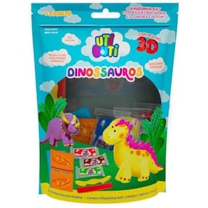Kit Massinha de Modelar Dinossauros Utiguti 03 massinhas soft 50g. 02 moldes de plástico. 01 rolinho. 01 faquinha. Não mancha - Contém glúten - Não tóxico. Embalagem abre e fecha, com fecho hermético. Recomendado para crianças a partir de 3 anos. Composição: àgua, carboidrato de cereais, cloreto de sódio, hidrocarbonetos alifáticos, aroma, conservante e pigmentos. Homologação Inmetro: IP-BRI-4776/2020-01