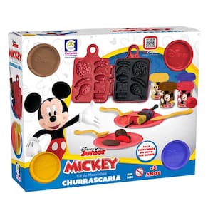 O Kit Massinha Mickey Churrascaria conta com diferentes cores de massinha e acessórios para as crianças criarem os mais variados pratos e churrascos.