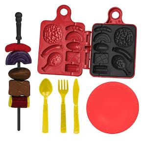 Contém: 1 Molde de Massinha, 1 Colher, 1 Faquinha, 1 Garfo, 2 Pratos, 4 Potes de Massinhas de 50g cada e 1 Espetinho.