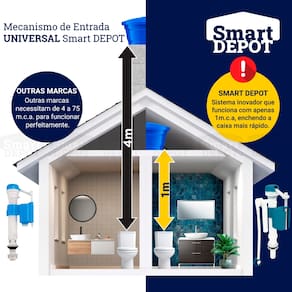 Diferente de outros kits de mecanismos do mercado que necessitam de 4 a 75 m.c.a para funcionar e quando instaladas em baixa pressão de água demoram a encher ou não funcionam, com sistema inovador, o nosso kit funcionam com baixas, médias e altas expressões de água, com apenas 1 m.c.a, enchem a caixa muito mais rápido.