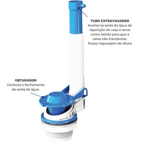 CARACTERÍSTICAS - Compatível com todos os tipos de louça. - Maior desempenho e economia. - Acompanha boia, anel de vedação e dois parafusos para fixação da bacia. - Feito em plástico resistente. - Vedação em silicone, garantindo maior durabilidade e resistência. - Permite a instalação em diversos níveis, sendo compatível com caixas acopladas de diversas alturas. - Tubo extravaso com regulagem telescópica. - Indicado para caixas acopladas com saída de 2 polegadas e entrada de 1/2 polegada. - Regulagem do volume de descarga através do obturador.
