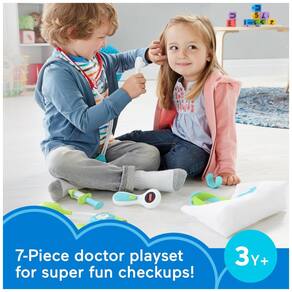 Kit Médico 7 Peças Inclui Estetoscópio, Esfigmomanômetro, Termômetro, Otoscópio, Seringa, Bandagem e Bolsa "Médico". Botão no termômetro alterna entre "doente" e "bom". Verifique a pressão do paciente: girar o visor. Tudo cabe na bolsa para "consultas domiciliares". Roleplay para pré-escolares de 3 a 6 anos.