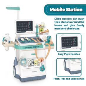 - Uma diversão completa de ferramentas médicas: o kit de carrinho médico vem com uma seringa, endoscópio, termômetro, gráfico oftalmológico, óculos e muito mais. Pressione o botão do estetoscópio e a luz acenderá e será acompanhada por um som.