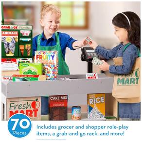 A coleção complementar para a mercearia Fresh Mart é perfeita para crianças a partir de 3 anos que adoram brincar de fazer compras e estocar prateleiras. São 70 peças de acessórios de mercearia, incluindo um avental, barra divisória de correia transportadora, sacola de compras, dinheiro virtual, cartões e cupons. Além disso, o conjunto vem com 5 caixas de supermercado, 3 latas de supermercado com tampa, um rack para levar com chicletes, protetor labial, barra de granola, cartões presente e cartazes. As crianças vão adorar passar horas desenvolvendo habilidades sociais enquanto brincam com outros pequenos. conjunto é um ótimo presente para crianças a partir de 3 anos e combina perfeitamente com a mercearia Melissa Doug Fresh Mart. A coleção pesa 1,02 quilos. A Melissa Doug é conhecida por criar produtos lindamente projetados que estimulam a imaginação e a criatividade das crianças.