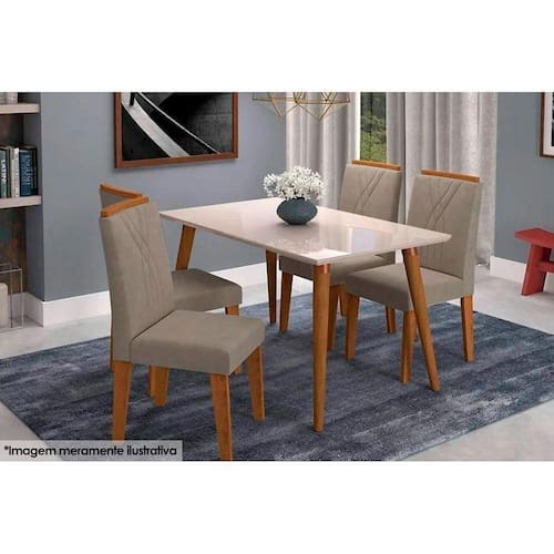 Sala de Jantar Completa Adele c/ Tampo Madeirado c/ Vidro 130cm + 4 Cadeiras Nicole Madeira/OW/Joli - Cimol Abaixo segue os produtos do KIT: Sala de Jantar Completa Adele c/ Tampo Madeirado c/ Vidro 130cm + 4 Cadeiras Nicole Madeira/OW/Joli - Cimol Mesa de Sala Jantar Adele + Tampo Madeirado Vidro 130x80cm Madeira/Off White - Cimol