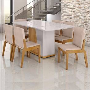 O tampo em MDF com vidro adiciona elegância, enquanto as cadeiras em linho oferecem conforto e design moderno.