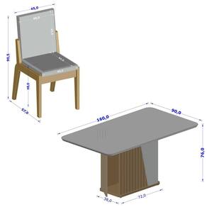 O tampo em MDF com vidro traz elegância, enquanto as cadeiras em linho garantem conforto e beleza.