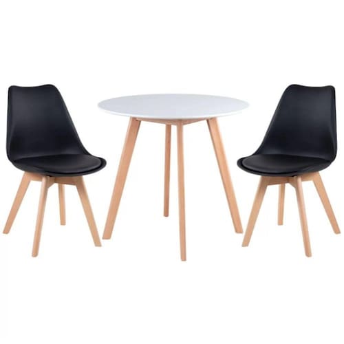 Mesa de Jantar Redonda 90cm Cor: BrancaDiâmetro: 90cm Altura: 75cm Tampo em MDF  2 Cadeiras Leda – Charles Eames, Saarinen Wood com almofada Preta Assento em Polipropileno com almofada em PU Base em madeira com acabamento arredondado Largura 49cm Profundidade 43cm Altura até o assento 45cm Altura até o encosto 82cmOBS: Montagem não inclusa. Acompanha manual de instruções e chave para a montagem.