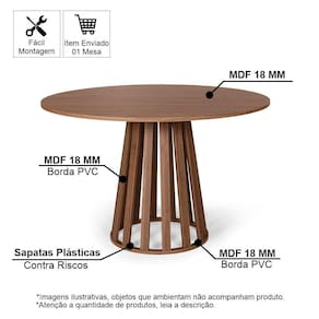 O conjunto é composto por uma mesa de jantar e 4 cadeiras, sendo que a mesa de jantar possui seu tampo e base fabricados em MDF 18 MM de altíssima qualidade em formato redondo com tamanho 120,00 CM.