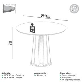 DIMENSÕES MESA: Alt: 78cm Larg: 105 cm Prof: 105cm P: 28,5kg DIMENSÕES CADEIRAS: Alt: 90cm Alt até o Assento: 48cm Larg: 48cm Prof Total: 56cm Prof do Assento: 43cm P: 7kg