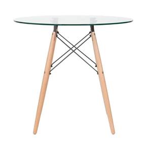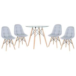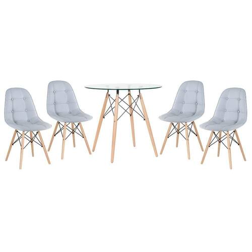 Kit com 1 x mesa de vidro Eames 80 cm + 4 x cadeiras estofadas Eames Botonê. CADEIRAS: Material do assento: Couro PU - Material da base: Madeira e aço - Altura do encosto: 82 cm - Altura do assento: 42 cm - Largura total: 46 cm - Profundidade total: 54 cm. MESA: Material do tampo: Vidro temperado 8 mm - Material da base: Madeira e aço - Altura: 75 cm - Diâmetro do tampo: 80 cm - : 3 meses.