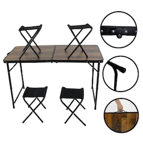 Kit Mesa Dobrável Portátil Que Vira Maleta Para Camping Praia Leve Alumínio 120cm Madeira + 4 Banquinhos Dobráveis