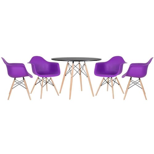 Altura: 75 cm | Cor: Preto | do fabricante: 3 meses | Largura: 100 cm | Peso do produto: 30 kg | Produto: Conjunto de Mesa e Cadeiras | Quantidade de lugares: 4 | Material do tampo (mesa): MDF laqueado (Laca fosca) | Material da base (mesa): Madeira e aço | Altura (mesa): 75 cm | Diâmetro (mesa): 100 cm | Material do assento (cadeiras): Polipropileno | Material da base (cadeiras): Madeira e aço | Altura do encosto (cadeiras): 79,5 cm | Altura do assento (cadeiras): 44 cm | Largura total (cadeiras): 62 cm | Profundidade total (cadeiras): 62 cm | Fabricante: Mobili | RBN: 17100657011 Cor: Mesa preto com cadeiras roxo