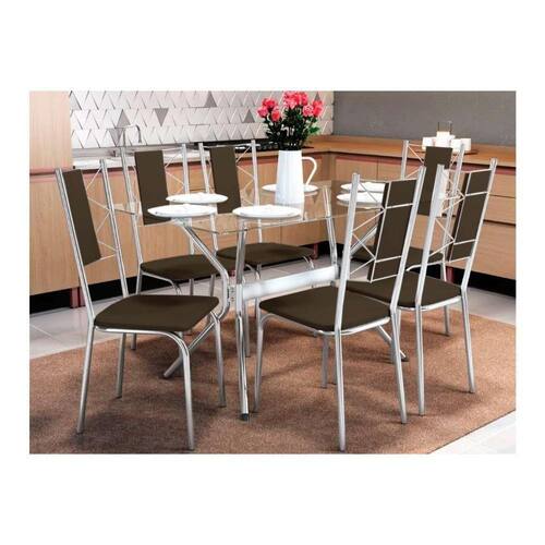 Conjunto: Mesa De Cozinha Loire C/ Tampo De Vidro 150cm + 6 Cadeiras Lisboa Cromado/marrom - Kappesberg