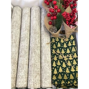 Composição/material Jogo Americano - 72% algodão e 28% poliéster Composição/material Guardanapo - 100% algodão e estampa digital. Composição Material Porta Guardanapo - Tecido sintetico e argola de madeira. Marca: Marphi Comercial