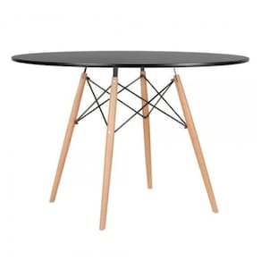 Cadeiras: material do assento: polipropileno - material da base: madeira e aço - altura do encosto: 81 cm - altura do assento: 43 cm - largura do assento: 46 cm - profundidade do assento: 40 cm - distância entre os pés: 40 cm - peso suportado: 130 kg. Mesa: material do tampo: mdf laqueado (laca fosca) - material da base: madeira e aço - altura: 75 cm - diâmetro: 120 cm.