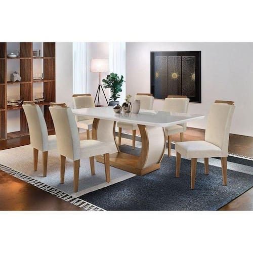 Conjunto: Mesa Sala Jantar Jade Tampo Madeirado C/ Vidro 180cm Canto Curvo + 6 Cadeiras Athenas Imbuia/creme - Rufato