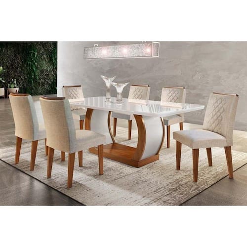 Conjunto: Mesa Sala Jantar Jade Tampo Madeirado C/ Vidro 180cm Canto Reto + 6 Cadeiras Jade Imbuia/creme - Rufato