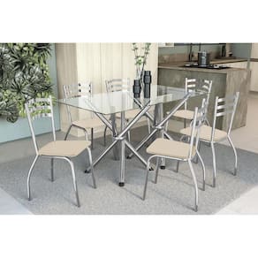 Sala de Jantar Completa Volga c/ Tampo Vidro 150cm + 6 Cadeiras Portugal Cromado/Courano Nude - Kappesberg