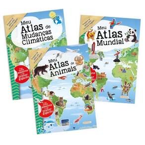 Descubra o mundo com o Kit Meus Atlas Essenciais ! Composto por três incríveis livros, este kit oferece uma jornada educativa e divertida pelo reino animal, mudanças climáticas e geografia mundial. Cada atlas é repleto de mapas ilustrados, lindos desenhos e fotos fascinantes, além de pôsteres gigantes e cartelas de adesivos para completar as páginas internas. Meu Atlas de Animais: Conheça as maravilhas do mundo animal, descubra as principais espécies, seus habitats, alimentação e comportamentos. Explore desde os menores animais até os maiores e os mestres da camuflagem. Meu Atlas de Mudanças Climáticas: Entenda os impactos das mudanças climáticas com informações detalhadas, mapas ilustrados e fotos. Aprenda sobre causas, soluções globais e como você pode contribuir para a ação climática. Meu Atlas Mundial: Viaje pelo mundo e aprenda sobre países, capitais, bandeiras, estilos de vida, paisagens e monumentos. Torne-se um explorador global completando as páginas com adesivos e interagindo com o pôster gigante. Prepare-se para uma emocionante viagem educativa e interativa com o Kit Meus Atlas Essenciais !