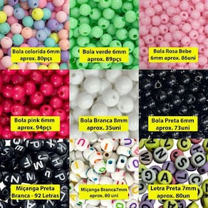 Kit Miçanga Infantil P/ Montar Pulseiras Strap Phone 1250pçsKit Criado com peças Coloridas e variadas para que você possa criar peças únicas, com seu estilo e personalidade, como Pulseiras, Colares, Strap Phone, Chaveiros, Decorar Materiais Escolares, Lembrancinhas, Acessórios para Pets e muito mais.O Kit é composto por peças com ótimo acabamento cores vivas, segue abaixo descrição do kit.12 Gr Miçanga Colorida Letra Preta 7mm aprox. 80 letras8 Gr de Borboleta Irisada Colorida translucida 13mm Aprox. 20 Borboletas10 Gr de Estrela Leitosa Passante Colorida 13mm Aprox. 22 Estrelas9 Gr Miçanga Redonda Colorida de Coração Aprox. 52 Corações6 Gr de Entremeio Emborrachado Olho Grego Colorido Aprox. 10 Entremeios6 Gr de Entremeio Emborrachado de Florzinha Aprox. 10 Entremeios13 Gr de Miçanga Preta Letra Branca Aprox. 92 Letras11 Gr Bola Lisa Leitosa Branca 8mm Aprox. 35 Bolinhas10 Gr Bola Leitosa Rosa Bebe 6mm Aprox. 86 Bolinhas10 Gr Bola Leitosa Preta 6mm Aprox. 73 Bolinhas5 Gr de Entremeio Emborrachado Emoji Aprox. 10 Entremeios5 Gr de Entremeio Emborrachado Frutinhas Aprox. 10 Entremeios12 Gr de Miçanga Redonda Branca Letra Colorida 7mm Aprox. 80 letras10 Gr de Bola Leitosa Lisa Pink 6mm Aprox. 94 bolinhas11 Gr de Bola Leitosa Lisa Verde 6mm Aprox. 89 bolinhas10 GR de Bola leitosa Colorida 6mm Aprox. 80 Bolinhas10 Gr de Fimo Fatiado de Florezinhas Coloridas Aprox. 400 uni1 - Organizador 17cm com tampa, trava de segurança e 15 divisórias.1 Rolo de silicone fio elástico com 10mts2 mts de fio de cetim colorido10 Cordinha com Gancho para Strap Phone e Chaveiro Marca: Adb