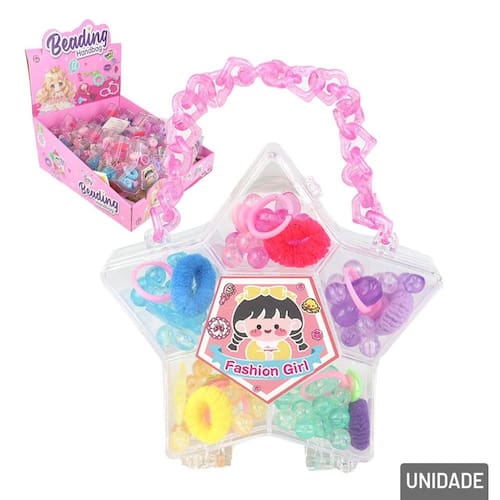 KIT Miçangas Biju e Acessório Bolsa Estrela Kit incluem uma seleção de Miçangas e Acessórios em cores e formas diferentes. Tem uma embalagem em forma lúdica de Estrela com alça, que traz uma visão de Mini Bolsa.\nIdeal para montar bijuterias artesanais infantis, como colares, pulseiras, gargantilhas e até tornozeleiras.\nEstimular a criatividade, a coordenação motora e oferecer uma atividade divertida e educativa para fazer em casa ou em grupo.\nDisponível em cores e modelos .\nEspecificações: Marca : MAXI BRAS\nTipo de material : Plástico, Nylon\nCores ou Estampa : Color\nDimensões do Produto : 3 X 12,5 X 15 CM\nDimensões da Embalagem : 3 X 12,5 X 15 CM\nPeso Bruto (Gramas) : 0.095 Marca: Não Informado