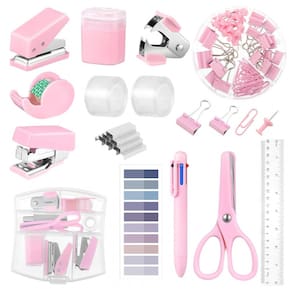 O kit mini escritório auroray rosa reúne em um único conjunto grampeador, furador, apontador, extrator de grampos, tesoura, dispenser de fita, régua, bloco adesivo, caneta, clips, binder clips, percevejos e grampos, formando um kit compacto de itens básicos para estudo e rotinas de escritório. As peças combinam componentes em metal e plástico com acabamento em tom rosa uniforme, criando um visual coordenado para mesa de trabalho ou área de estudo. O formato reduzido facilita o transporte em mochilas, bolsas ou pastas, sendo adequado para estudantes, profissionais em deslocamento e uso em espaços com pouco espaço disponível.